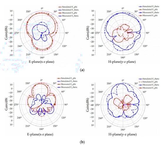 Simulated and measured radiation patterns of the proposed DRA array: (a) 2.45 GHz; (b) 5.8 GHz.