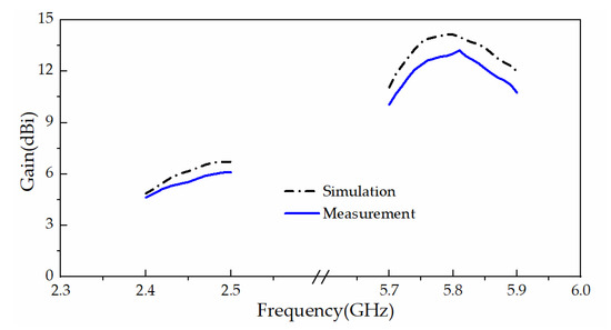 Figure 9 depicts the simulated and measured gain of the DRA array. The measured and simulated results show good agreement. The simulated and measured gains of the antenna array are 6.2 dBi and 5.5 dBi at 2.45 GHz, respectively. The simulated and measured gains at 5.8 GHz are 14.2 dBi and 12.9 dBi, respectively. Differences are probably owing to two main factors: (1) The insertion loss of the fabricated feeding network is larger than the simulation; (2) The insertion loss of the SMA connector utilized to test the prototype is not included in the simulations.
