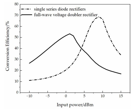 The full-wave voltage doubler rectifier is chosen mainly because it is simple and has a higher conversion efficiency than the traditional half-wave rectifier circuit in the application of 10 mW. Its efficiency compared with the traditional single series rectifier circuit is shown in Figure 10. The selection of diodes has a crucial impact on the performance of the rectifier since they bring the main loss. High series resistance (RS) and zero bias junction capacitance (Cj0) of diodes will reduce conversion efficiency [1], while the reverse breakdown voltage (Vbr) of diodes will limit the maximum rectified power. Table 1 compares the important parameters of several commercial rectifying diodes. Finally, the HSMS2860 Schottky diode is selected, which has high voltage sensitivity at low input power.