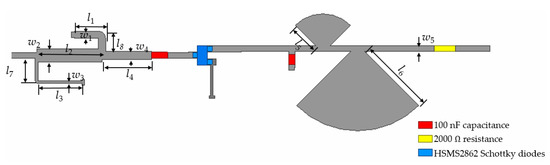 Configuration of the proposed rectifier circuit: l1 = 3.5 mm; l2 = 8.7 mm; l3 = 6.3 mm; l4 = 6.6 mm; l5 = 5.1 mm; l6 = 12.9 mm; l7 = 5.1 mm; l8 = 1.5 mm; w1 = 1 mm; w2 = 1.8 mm; w3 = 0.4 mm; w4 = 1.2 mm; w5 = 0.8 mm.