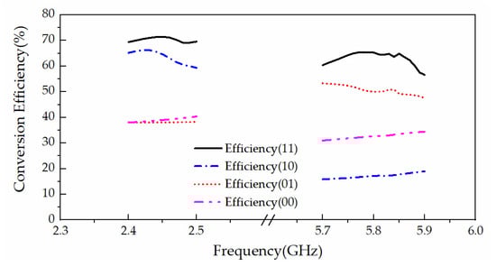 The measured results are given in Table 2. The conversion efficiency of the proposed rectenna reaches 47.7% at 2.45 GHz and 40.3% at 5.8 GHz. The results show that the proposed rectenna can efficiently harvest RF energy. Compared with the performance of the rectifier, the conversion efficiency decreases. This could be caused by two things. On one hand, due to the error of the power probe, there may be measurement error in the transmission power. On the other hand, the DRA array and rectifier circuit are integrated on different dielectric substrates; the RF adapter connecting the proposed DRA array and the rectifier circuit have unavailable parasitic behavior.