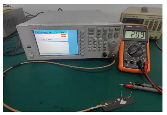 The proposed rectifier is fabricated and it is shown in Figure 14. The conversion efficiency measurement setup is displayed in Figure 15. The power source is a 2–6 GHz signal generator; a multimeter is utilized to measure the DC voltage across the load, and the efficiency is calculated as: