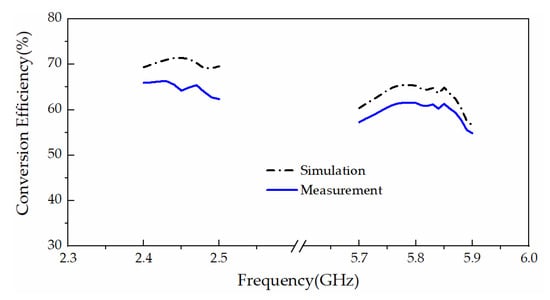 Where VDC is the DC voltage across the load, RL is the load resistance value, and Pr is the RF input power. The load resistance is 2 KΩ since it is suitable for many small wireless devices. The input power level is selected as 10 dBm due to the good performance at this input level for signals of two frequencies in the simulation. It can be seen that the proposed rectifier circuit covers the required frequency bands in Figure 16. At 2.45 GHz, the simulated rectifier efficiency is 72% and the measured result is 66%. At 5.8 GHz, the simulated rectifier efficiency is 65% and the measured result is 62%. The measured efficiency is lower at both low frequency and upper frequency bands, which might be caused by the difference in diode parameters between simulation and fabrication.