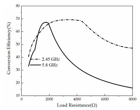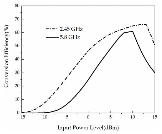 When the load resistance is 2 KΩ, the measured conversion efficiency variation with the input power level at 2.45 GHz and 5.8 GHz frequency is shown in Figure 17. The efficiency can be maintained above 50% when the input power level is 0–15 dBm (2.45 GHz) and 5–13 dBm (5.8 GHz). Figure 18 shows the measured conversion efficiency varying with load resistance at 2.45 GHz and 5.8 GHz. When the load resistance is 1–8 KΩ (2.45 GHz) and 0.8–2.2 KΩ (5.8 GHz), the efficiency can be maintained above 50%. The range for 5.8 GHz is very small, which is caused by larger diode loss at higher frequency.