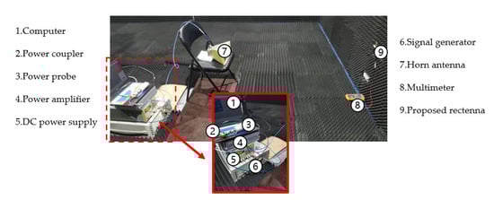 In this paper, λ is the wavelength of the operating frequency, r is the distance between the transmitting antenna and the proposed DRA array, Pt is the transmission power. Gt is the gain of the transmitting antenna, and Gr is the gain of the proposed DRA array. Figure 19 shows the conversion efficiency measurement setups of the proposed rectenna. The microwave power output from a signal generator is amplified by an amplifier with a gain of 42 dB. A broadband horn is used to transmit energy signals. The receiving antenna is at the distance r from the horn. The measurement procedure is as follows: