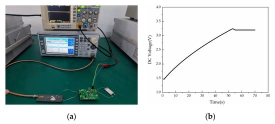 The conversion efficiency measurement. (a) Measurement setups; (b) DC Voltage across the supercapacitor.