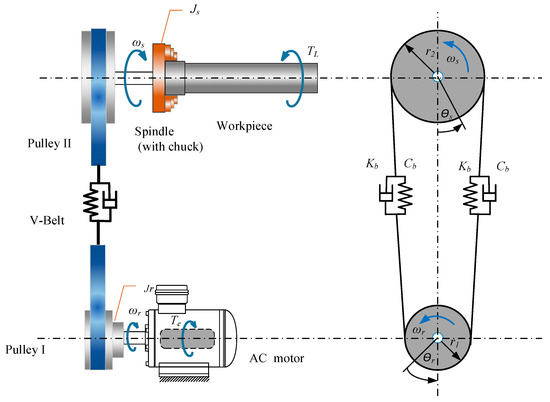 Lumped parameter models are used to evaluate the belt transmission performance. This method simplifies the mathematical model. Previous studies [12,26,27,28] have established simplified dynamic models of turning processes. For the study to be accurate, both the belt deformation and motor electromagnetic characteristics must be considered. Hence, in this paper, we present a complete electromechanical system model, in which the equations of motion associated with the mechanical components (pulleys, belt transmission, and spindle) are coupled and solved along with the equations that describe the electromechanical responses.