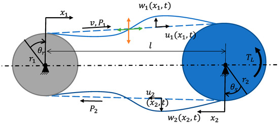 In Equation (11), the static axial tension is assumed to remain constant for the translating belt. The second term is for the dynamic component due to belt transverse motions, and the comma preceding or refers to the partial differentiation from or with respect to the previous one. and represent the neutral-axis coordinates. denotes the time. Transverse displacements and refer to the above and below belt spans, respectively, and longitudinal displacements and refer to the above and below belt spans, respectively. With the boundary conditions of the system,