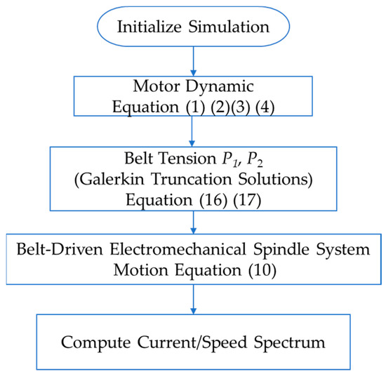 In this study, the dynamic responses of the systems are examined via the rotational frequency of the input shaft, drive pulley, belt, and spindle of a lathe, as well as the steady-state response of the motor current. To analyse the influences of belt transmission, the typical excitations and system parameters were varied within specific ranges, and the physical and geometric properties of the motor and belt are presented in Table 1 and Table 2. The simulation calculation process is illustrated in Figure 5. To solve differential Equations (10), (16), and (18), the fourth-order adaptive Runge–Kutta algorithm is used with variable step size, but the outputs are at a constant step size dt = 10−5.