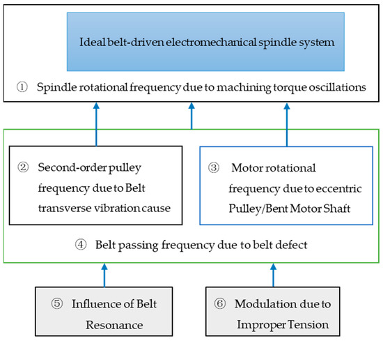 Based on the baseline models developed, numerical analysis was implemented for typical cases in the machining process, as depicted in Figure 6. In particular, the modulation of current responses and the fluctuations of speed signals were examined in the frequency domain, where the belt drive system is subjected to multiple excitation sources including machining loads, as well as different belt and pulley conditions. In Section 3, these conditions are described quantitively.