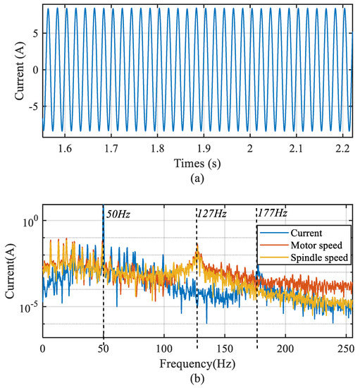 The steady-state response of the motor current in one phase is shown in Figure 7. In Figure 7a, the time–domain waveform of the current signal shows that the periodic signal with the supply frequency dominates the content. However, in the frequency domain, there were numerous spectral lines, as shown in Figure 7b. This system has a speed resonance frequency of 127 Hz. The spectrum shows that the system resonates at 177 Hz.