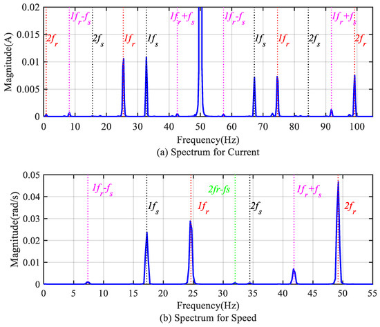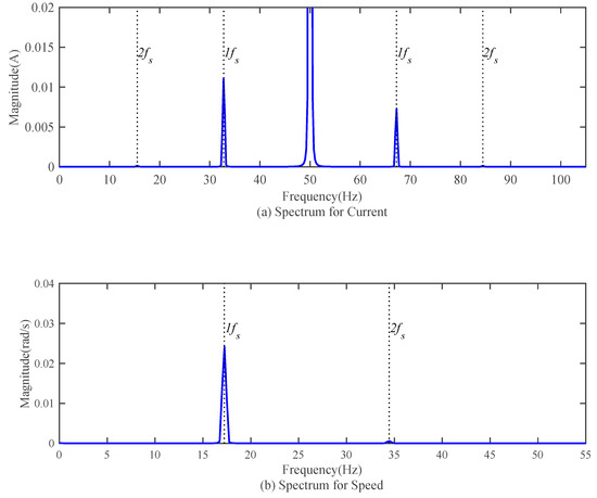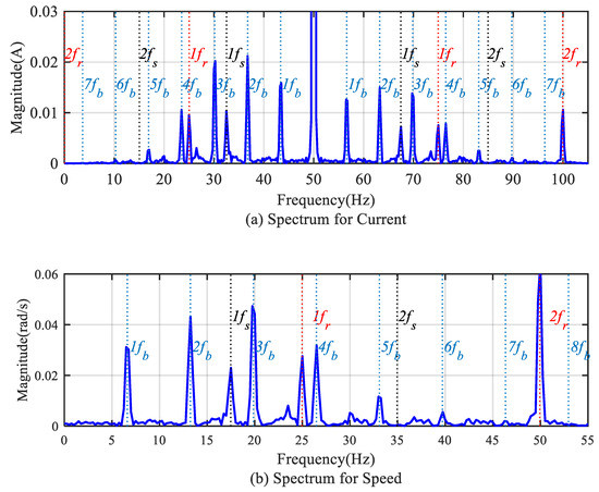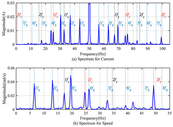 As the rotational vibration is closely related to belt tension, this section examines how the belt tension influences modulation signals. Figure 12 illustrates the spectra of the current and speed when is reduced to 260 N. Compared with Figure 10, it can be observed that reducing leads to a clear increase in the amplitude at 2. However, the spectral amplitudes at other frequencies, such as and , including their harmonics, showed little change.