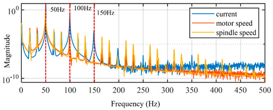 To examine the details of the current and speed spectra, the rotation frequency of interest, such as the motor rotating frequency , spindle rotating frequency , and belt-passing frequency , were calculated as follows: