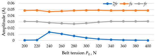 To monitor the condition of the machining system using the modulation sideband, it is necessary to ensure that the tension is within the appropriate range. As shown in Figure 13, the amplitude of 2 is extracted when is linearly adjusted and the driving pulley speed is constant. On increasing the tension force, the amplitude of the transverse vibrations is decreased; however, the frequency of the vibrations remains unaltered. Similarly, low tension results in a low 2 sideband amplitude, as power cannot be transferred to the belt drive because of the low tension. Additionally, the amplitude at did not change when the tension was increased to a certain extent, indicating that the belt was not tensioned appropriately.