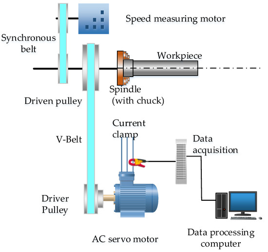 An experimental test system was developed to assess the validity of the developed model, as shown in Figure 14 and Figure 15. The work was conducted on a CNC lathe, CAK3665, which is widely used for machining purposes. A three-phase AC motor was used to drive the spindle, which was connected to a belt system comprising three v-belts, a driver pulley, and a driven pulley. The experimental equipment and parameters are listed in Table 3.