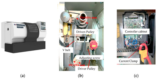 Experimental facilities: (a) CNC lathe, (b) belt transmission system, and (c) current clamp installation position.