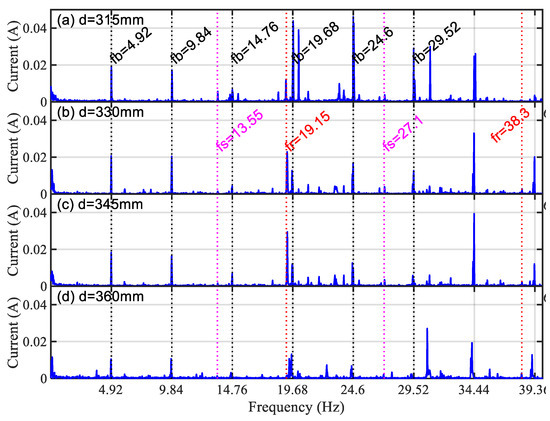 A belt tension increase is observed when the belt pulley center distance is increased (315 mm–360 mm). In Figure 16, it is consistent with the simulation results, that the modulation characteristics of the current signals revealed that belt looseness can cause a high degree of modulation, reflected by the rich harmonic sidebands at the belt-passing frequency in the motor current spectrum.