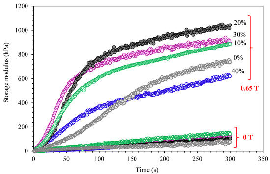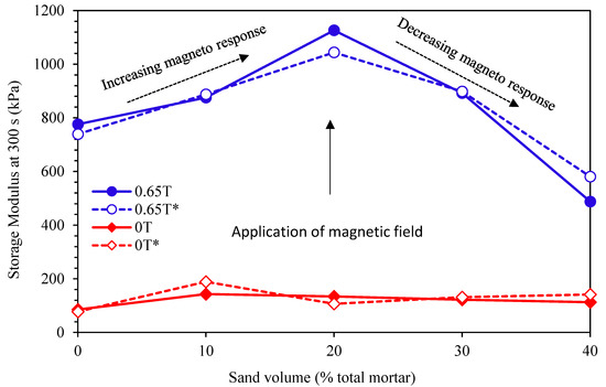 - The magnetorheological response, measured using the oscillatory time sweep tests, increases with increasing volume fraction of sand until a threshold value after which the presence of fine aggregates begins to limit the movement of the MNPs.