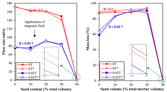 - Using ASC, the flow rate is significantly reduced for all mixtures due to the formation of magnetic clusters at the outflow. However, the flow reduction is reduced when the sand concentration is low in comparison to the reference paste.