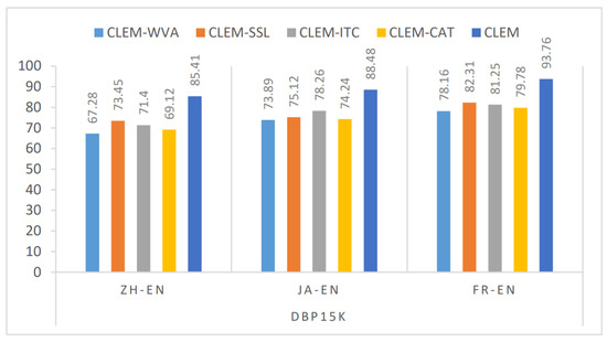 The Multi-View Integration Experiment. To verify the effectiveness of our multi-view representation learning method, we conducted the multi-view integration experiment in terms of Hits@1. Figure 3 shows the results. Compared with other variants, we observed that the Hits@1 of our proposed method increased at least 10.22%. This is because compared with the multi-view integration methods of MultiKE, our applied MISL handled the relevance and complementarity between different modal entity information in the intact space better. The use of the MISL method successfully integrates the multi-modal information from each view to generate the final entity representation, which effectively improves the results of the entity matching. In addition, we found that the CLEM-CAT is inferior to the other variants. This may be due to the fact that the concatenation method does not have the training process, and the integration after training cannot fully consider the association between different modalities.
