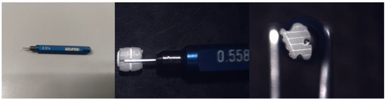 Azurea pin gauges (Azuréa Technologies S.A., Switzerland) with increments of 0.002 mm were used to measure the height of each slot (Figure 2). The gauges were inserted inside the slot of each bracket, beginning with the gauge with the greatest diameter (0.584 mm), and an Optika B500 optical microscope (Optika S.R.L, Ponteranica, Italy) was used to check that the gauge was in full contact with the bottom of the slot (Figure 2). The slot height was recorded as the diameter of the gauge that filled the slot completely from top to bottom (Figure 2). Measurements were conducted by a single operator (CC) and repeated two weeks apart.