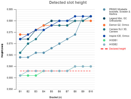 Subsequently, for each of the seven types of bracket, the measured slot height was compared with the nominal slot height declared by the manufacturers (0.558 mm) to verify the production accuracy. The Wilcoxon nonparametric test (p < 0.05) was used for this purpose.