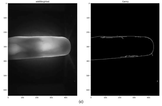 Figure 3a shows the bilateral image after processing using a Sobel operator. The pixel and the weighting result between the Sobel operator and the bilateral filter’s processed images are shown in Figure 3b. This method contrasts and enhances the finger outline and increases the effect of the Canny edge detector. It is difficult to achieve denoising and accurate edge detection so smoothly edged images are less accurate. However, increasing the sensitivity of edge detection increases the perceived noise signals. To address this issue, a Canny edge detector [] is used to balance denoising and detection accuracy. This algorithm gives precise detection, a low error rate and produces detailed edge outlines, so the Sobel operator’s results are processed using Canny edge detection. The multi-layer edge detection method gives stable finger outline information, as shown in Figure 3c. An image that is processed using Canny edge detection still contains small cracks and unevenness so a closing operator from morphology studies is used to complete the finger edge outline while maintaining the finger position and shape, as shown in Figure 4.