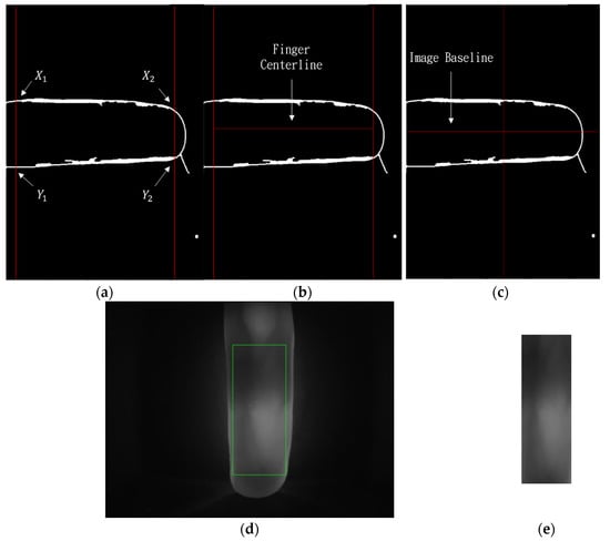A user’s finger is displaced when it is inserted into the biometric device so this study proposes a region of interest (ROI) detection method to acquire stable and applicable vein character information. Canny edge computation firstly identifies X1 and Y1 on the left half and X2 and Y2 on the right half of the subject finger, as shown in Figure 5a. The center of the left and right halves of the finger is located through these points. The center points are then used to calculate the finger’s center baseline, as shown in Figure 5b. The calculated baseline is compared to the finger’s inherent center line, as shown in Figure 5c. Adjustments for skewed and shifted angles use calculated rotations. This normalization process decreases the chance of incorrect identification. The green bounding box (ROI) is derived from the normalized image, as shown in Figure 5d. Then, the normalized image, as shown in Figure 5e.