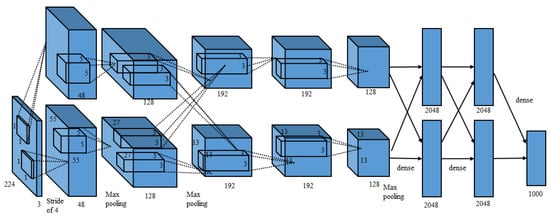 This study uses the AlexNet CNN because it categorizes very effectively. Unlike earlier neural networks (NN), AlexNet uses the activation function ReLu to accelerate convergence and dropout, in order to prevent overfitting. This NN has 60 million parameters and 65 million neurons and the AlexNet’s network architecture contains 12 layers: 1 input layer, 5 convolutional layers, 3 pool layers and 3 fully connected layers, as shown in Figure 7.
