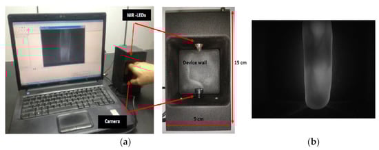 The FV-USM dataset is created by Universiti Sains Malaysia. It contains vein images of 123 subjects’ left and right index and middle fingers. The subjects include 83 males and 40 females, with ages between 20 and 52 years. The vein imaging process requires subjects’ fingertips to contact the device base, as shown in Figure 8a. Each subject provides 6 images of each finger on each hand. The testing environment has unstable light sources, but the fingers are stably positioned so the resolution is 640 × 480, as shown in Figure 8b.