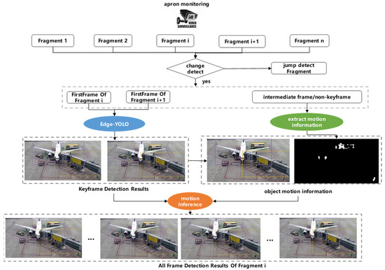 The second strategy is to employ motion inference to avoid frame-by-frame detection. The objects in the airport apron usually take regular slowly movements, due to the civil aviation relevant rules. Thus, there should be same object in most of near frames of the video. This means that not all frames need to be detected. Even a few frame detections might be able to get all objects. These frames are defined as key frames. Thus, the video could be divided into small segments with duration. The results for non-key frames are inferred from the detection of key frames, according to the motion information. The results of non-key frames are inferred from the detection of key frames, according to the motion information. There are two methods to extract the motion information of objects: matching based on IOU, and matching based on the improved T frame dynamic and static separation method.