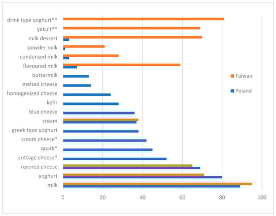 Most commonly consumed dairy products (%) (* products typical for Poland, ** products typical for Taiwan).
