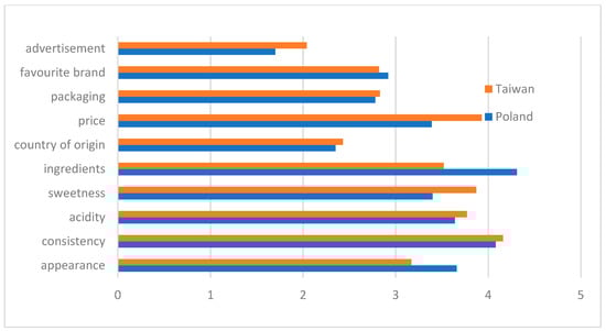 The objective of RQ4 was to identify the characteristics of yogurt that influence the decision to purchase it by Taiwanese and Polish students. The most common characteristic of yoghurt that influenced Polish students’ purchase decision was its composition, followed by its consistency, then the appearance of the yoghurt and its sour taste. For Taiwanese students, factors such as consistency, price and sweetness of the yoghurt were the most important determinants of the yoghurt purchase decision.