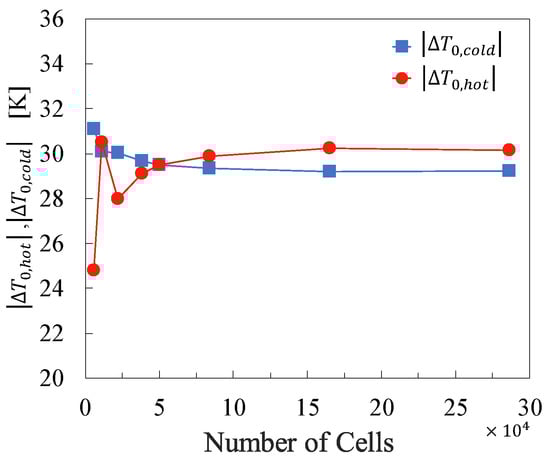 For the numerical methods, pressure-based coupled algorithms were used for pressure-velocity coupling, and the QUICK scheme was applied to the spatial discretization of variables. The residual criterion for convergence was set to 10−6. A grid test was conducted under the experimental conditions of cmf = 0.5. The quadrilateral grid system with finer grids near the inlet and two exits was used. Figure 2 shows the grid convergence test result. denotes the total temperature difference between the hot exit and inlet, and represents the total temperature difference between the cold exit and inlet. When the number of computational cells is more than 85,000 (with an average orthogonal quality of 0.99), the total temperatures at the hot and cold exits do not change significantly. Thus, in this study, we used the grid system with 85,000.