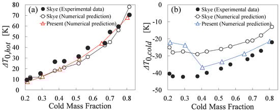 Figure 3 shows a comparison of the simulation results with Skye’s data []. When calculating the total temperatures at the hot and cold exits, mass-weighted averaging was applied. The present simulation results agree well with the experimental data. In particular, the prediction at the cold exit is better than Skye’s prediction, except in the low cold mass fraction region. The sudden reduction in in the low cold mass fraction region is attributed to the backflow of atmospheric air at 294 K through some area of the cold exit. The partial backflow is attributed to the presence of a large zone with negative pressure near the cold exit. This trend was also observed in Skye’s experimental and numerical data. The backflow through the cold exit disappears with an increase in the cold mass fraction.