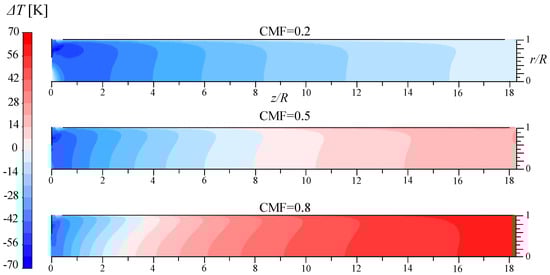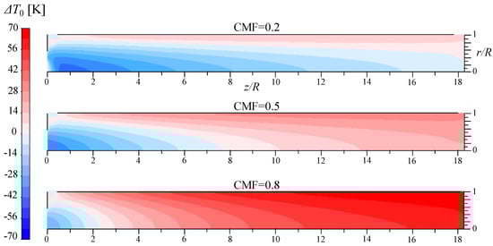 We discuss the simulation results of each of the exemplary cold mass fractions of 0.2, 0.5, and 0.8 to understand the total temperature separation. Figure 4 shows the total temperature difference contours for different cold mass fractions, where denotes the local total temperature minus the inlet total temperature.