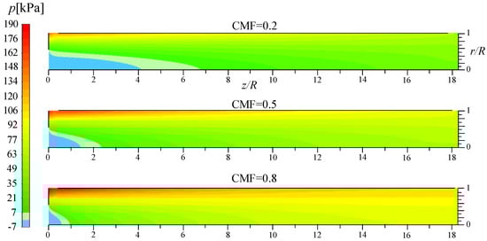 Figure 11 shows the distributions of , , and along the axial-direction line at r/R = 0.1 (core vortex region). The value of is considerably higher than those of and . This means that the axial pressure gradient in the near-axis region is the major contributor to an increase in temperature in the axial direction. Overall, the value of is higher for cmf = 0.8 than that for 0.2, which implies that the axial pressure gradient increases with the cold mass fraction and is consistent with the pressure contours shown in Figure 5. The higher the cold mass fraction, the higher the axial pressure gradient in the near-axis region. This is because as the pressure in the near-axis region at the hot exit section increases due to narrowing the hot exit area by the throttle valve, the return of flow from the hot exit section toward the cold exit section becomes large.