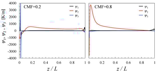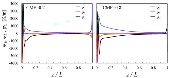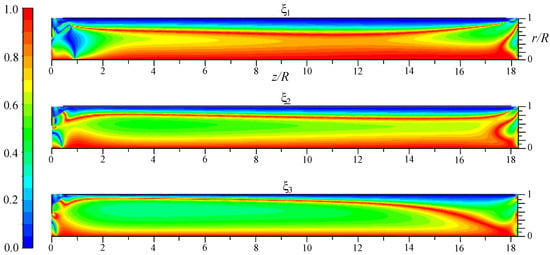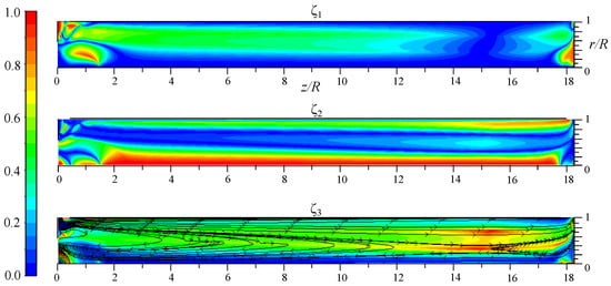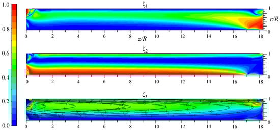 where , , and represent the measures of the relative importance of the first, second, and third terms on the right-hand side of Equation (7), respectively. Figure 9 and Figure 10 show the , , and contours and streamlines for cmf = 0.2 and 0.8, respectively. is dominant in the inner core region; and are large in the periphery region and tend to have similar values, except in the region near the hot exit. Figure 9 shows that is very high at approximately , which is attributed to the increased turbulent viscosity there. As seen in the streamlines created using the radial and axial velocities, the flow is complicated because of the presence of the stagnation point.