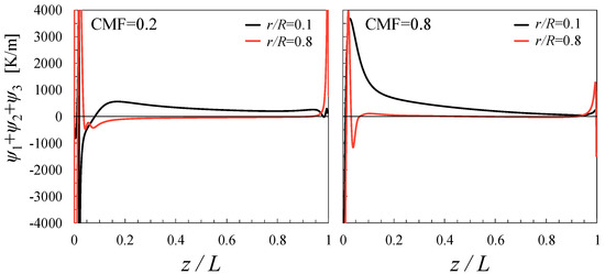As shown in Figure 6, the axial velocity is positive and negative in the periphery and core regions, respectively. The calculations are performed along the axial direction lines at r/R = 0.1 and 0.8 to avoid the singularity in calculating and from Equation (8). The two horizontal lines belong to either the core or periphery region; the sign of does not change in most regions of each horizontal line. It is desirable to interpret the positive and negative values of as positive and negative contributions to , respectively, because the heat conduction effect was not included and some assumptions were used in Equation (7).