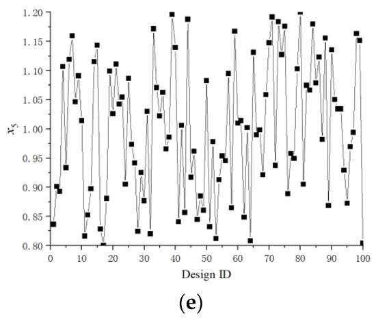 Experimental design points for each input variable: (a) x1, (b) x2, (c) x3, (d) x4, (e) x5.