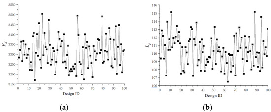 The OLHS was used to obtain experimental design points of each input variable, which is shown in Figure 4. As plotted in Figure 4, each design variable has a relatively uniform distribution in its design space. Figure 5 shows the objective variables corresponding to the experimental design points, which are the aerodynamic resistance and the dipole noise source of a high-speed train.