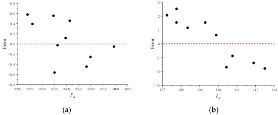 The RBF neural network was used to establish the approximate calculation model between input variables and output variables. Figure 6 presents the differences between the predicted and actual values of the aerodynamic resistance and dipole noise source, where Figure 6a indicates the percentage error of aerodynamic resistance, and Figure 6b indicates that of the dipole noise source. As shown in Figure 6, the percentage error between the predicted values and actual ones of aerodynamic resistance is less than 1%, and that of the dipole noise source is less than 3 dB. Thus, the approximate calculation model established by the RBF neural network has a good approximation effect.