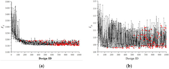 Figure 8 shows histories of objective variables. The pattern “★” indicates the value of objective variable on the Pareto front. As plotted in Figure 8, through the sampling of the optimization algorithm in the design space, the time histories of aerodynamic resistance and dipole noise source show a decreasing trend. The streamlined head shape is gradually improved towards the optimization of aerodynamic resistance and dipole noise source.