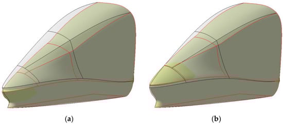 Because of the good symmetry of the streamlined head shape, only half of the streamlined head needs to be parameterized. The streamlined head is very complex, which is composed of several sub-surface pieces through certain continuous order splicing. In this paper, the left half of the streamlined head shape is composed of B-spline surfaces. Control points are firstly established on the streamlined head, 12 B-spline curves are established from control points, and 7 B-spline surfaces are finally established from these 12 B-spline curves. Thus, the left half of the streamlined head shape is established [18], which is shown in Figure 2. On the basis of Figure 2, the three-car formation train model will be easily established.
