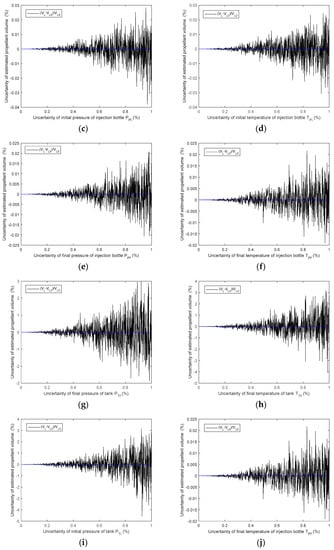Effect of each factor on the final mass gauge uncertainty ((a) is of the total volume of the tank, (b) is of the injection bottle volume, (c) is of the initial pressure of the injection bottle, (d) is of the initial temperature of the injection bottle, (e) is of the final pressure of the injection bottle, (f) is of the final temperature of the injection bottle, (g) is of the final pressure of the tank, (h) is of the final temperature of the tank, (i) is of the initial pressure of the tank, and (j) is of the final tenperature of the injection bottle).