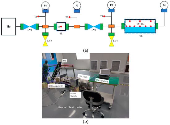 From Figure 5a,b, one can see the ground test setup. There is a helium gas source of approximately 13~15 MPa, an injection bottle of approximately 1 L, a propellant tank of approximately 70 L, some valves, and pressure and temperature sensors. The volume in the ground test is chosen to be small to reduce the danger as well as reduce the cost, which is approximately 10 times smaller than the theoretical model. LV1 and LV2 are valves used in the high pressure and LV2 and LV4 are valves used in the middle pressure. Temperature sensors T1 and T2 are set in the tube at the injection bottle inlet and outlet and T4 is inside the injection bottle to monitor the injection bottle temperature. Temperature sensors T3 and T5~T13 are installed in the tank inlet tube as well as on the shelf, which is built into the tank to monitor the inner gas temperature. All the test data are analyzed with a PC. When the gas injection test was conducted, the gas injected into the injection bottle and tank is released from LV3 and LV4, which will cause the pressure to be equal to the environment.