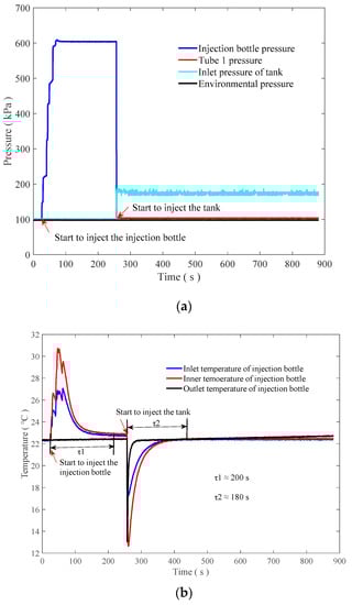 Considering the reference, the valve shut down when the pressure of the injection room and tank were equal. Then, the temperature reached a new balance after a period. Focusing on the time response, the pressure balance is reached within a few minutes but the temperature changes slowly. Consequently, the heat exchange of the gas in the injection room and tank with the outside environment can be neglected when the pressure becomes equal. The gas in the injection room and tank has no heat exchange.