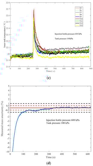 Figure 6 shows the process of the gas injection method during which the pressure and temperature are recorded. Based on the pressure and temperature and the true value of the tank liquid, the liquid mass gauge uncertainty is calculated. The calculated results fit well with the true value of the liquid mass in the tank, with uncertainty within 0.3% FS after gas injection (t = 0 s in Figure 6c) into the tank for approximately 330 s.