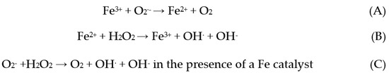 The reduction of Fe (III) by the superoxide radical (A), the Fenton reaction (B) and the complete oxidation-reduction process are known as the Haber–Weiss reaction (C).