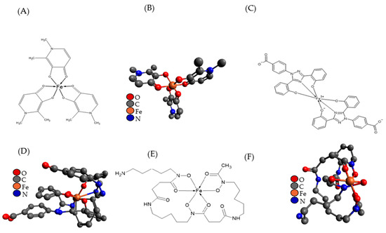 (A,B) show deferiprone, the bidentate chelator, bound to iron occupying its full coordination in a 3:1 ratio (3 deferiprone: 1 iron) and its 3D arrangement are, respectively, optimised. (C,D) show the tridentate chelator deferasirox bound to iron in a ratio of 2:1 (2 deferasirox to 1 iron). These chelators are more likely to be redox-active than hexadentate chelators as they can leave sites free for Fenton chemistry. (E,F) show the hexadentate chelator bound with iron Ferrioxamine B. Ferrioxamine is not redox-active, as it binds iron 1:1 and therefore cannot leave any sites free.